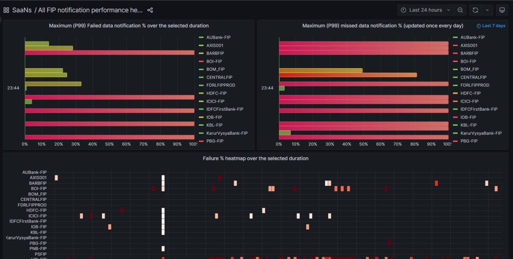 - b. Failed notifications, i.e. the % of data requests for which the FIP sent a notification indicating FI is NOT ready. This could either be owing to internal timeouts or business declines at the FIP’s end. This is measured in real-time, every 10 min, by the AAs for each FIP. The 10-min summaries are then plotted in SaaNS.