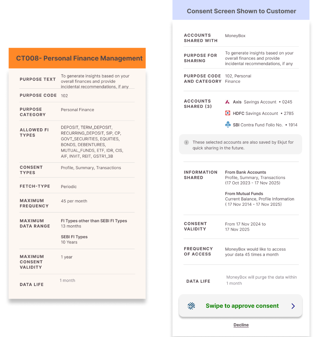 Similarly, the same data cannot later be reused for a different purpose without a separate valid consent. To show dashboards under PFM, a distinct consent for PFM must be obtained from the customer. This ensures that customers are fully aware of and agree to each specific purpose for which their data is used (and consequently, customers can manage their consents at a purpose-specific level), maintaining compliance with fair use rules and Sahamati’s Code of Conduct. Kindly refer to the Fair Use Template Library and Sahamati Code of Conduct – Purpose Limitation, CC026.