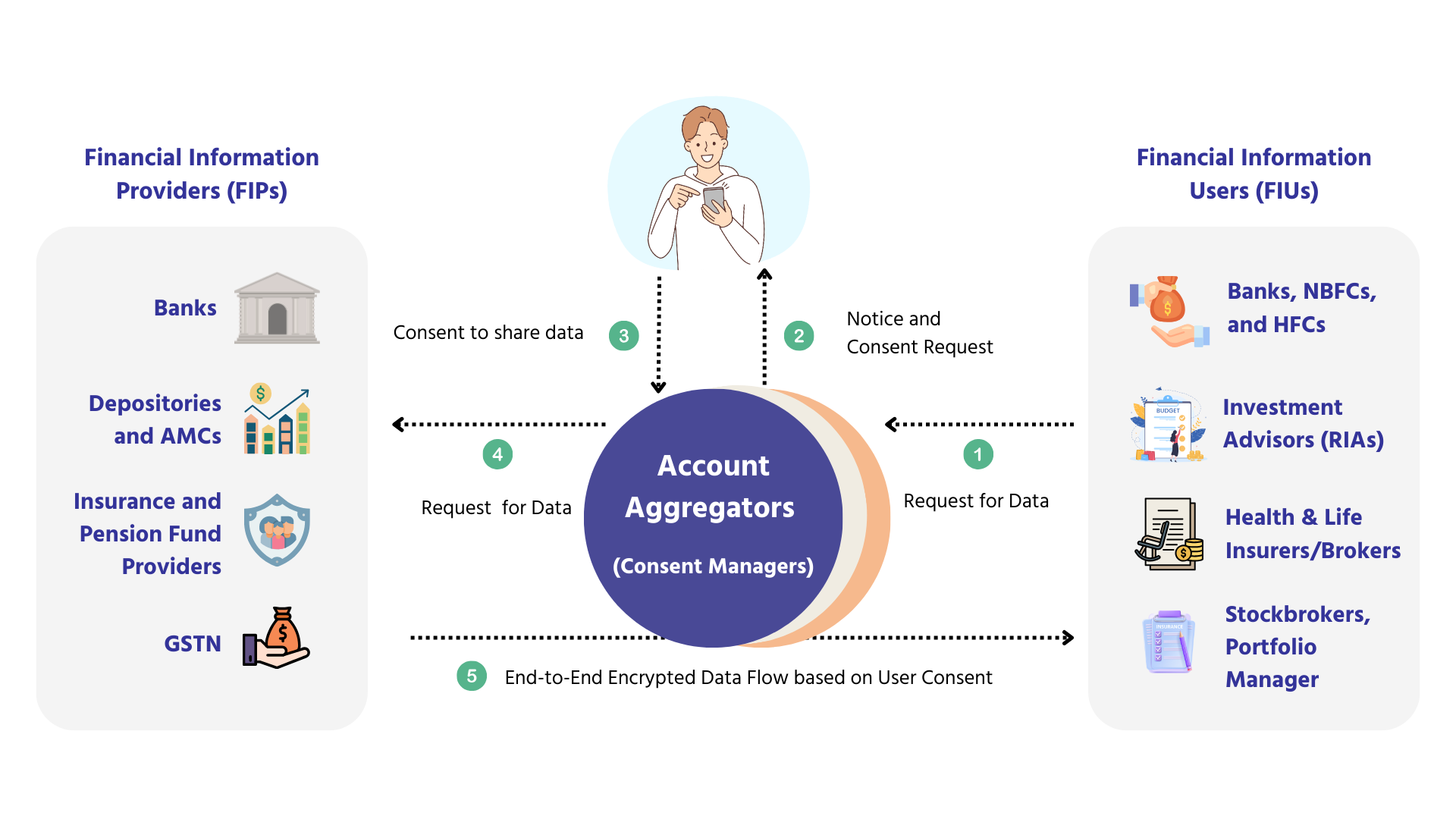 The main participants of the AA ecosystem are the Account Aggregator (AA), the Financial Information Provider (FIP) and the Financial Information User (FIU) working together to simplify the process of sharing data.